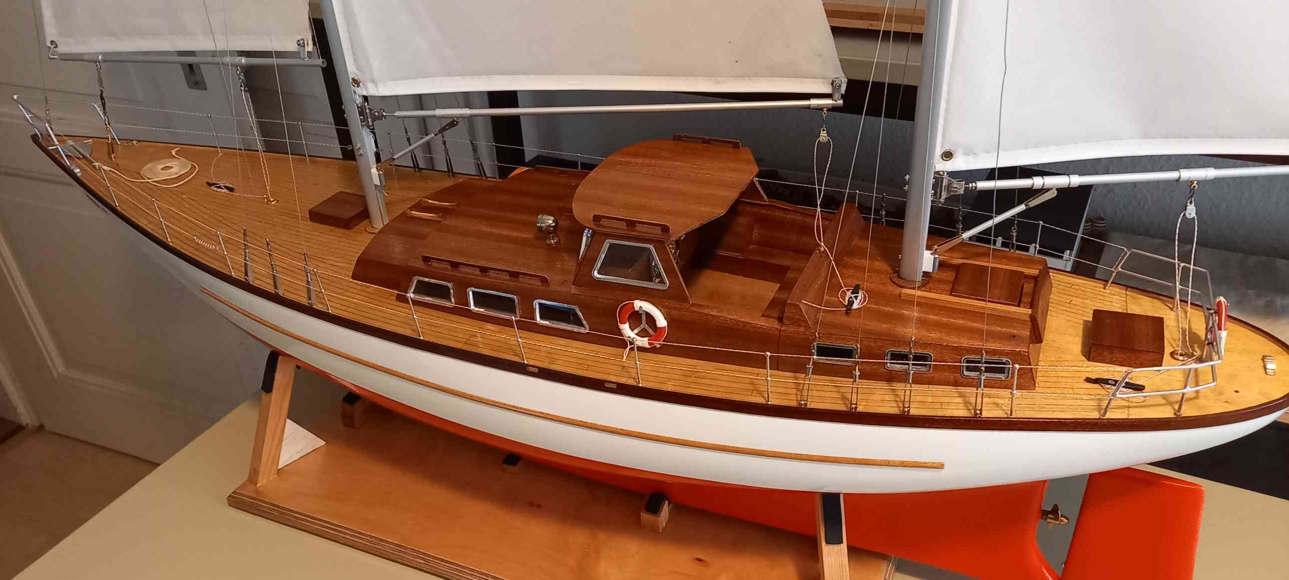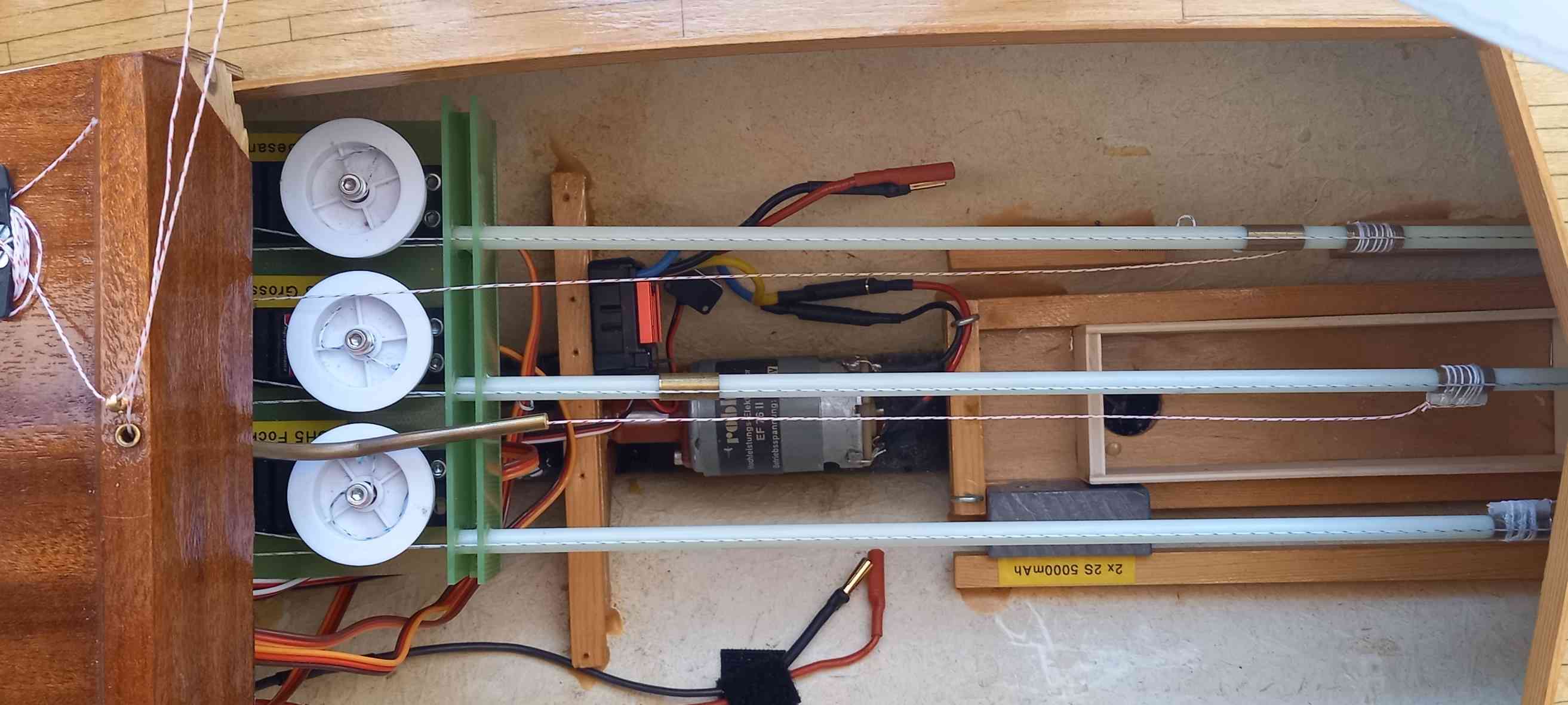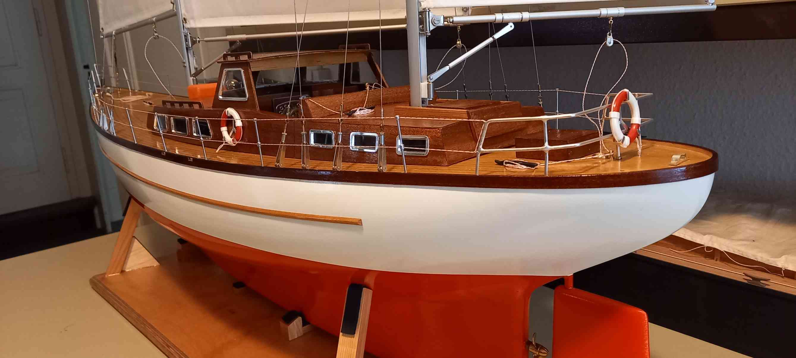 Basis ist ein in die Jahre gekommenes, sauber gebautes Modell. Restaurationsarbeiten: Neulackierung, Deckabschluss verstärkt, neue Bäume und Niederhohler, Bug-, Heckkorb hart gelötet und die Reling aufgefrischt. Um die Zugänglichkeit zur RC-Anlage zu vereinfachen, ist der Aufbau vor dem Besanmast getrennt und ohne lösen der Takelage abnehmbar. Ziel, ein gut segelndes Modell, die Vorbildtreue ist weniger wichtig.