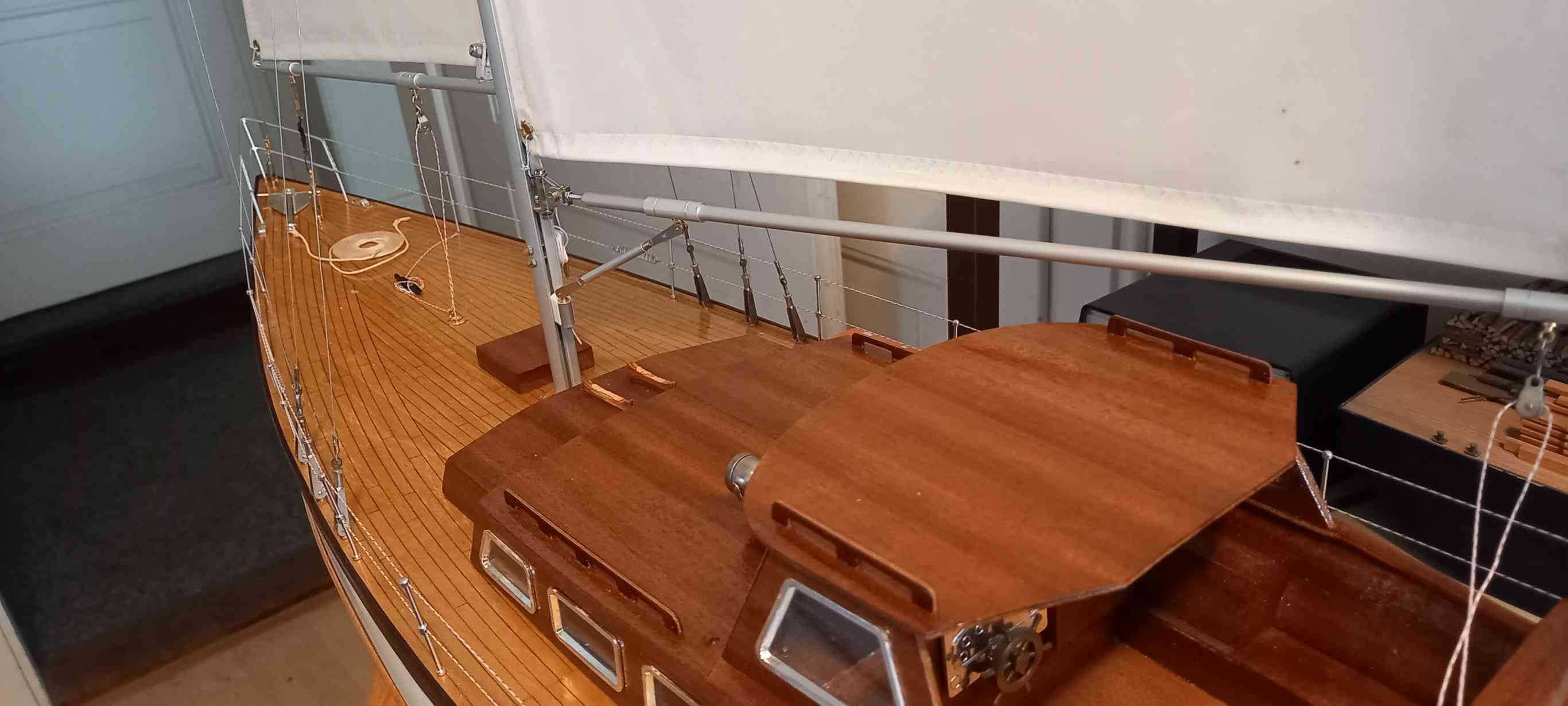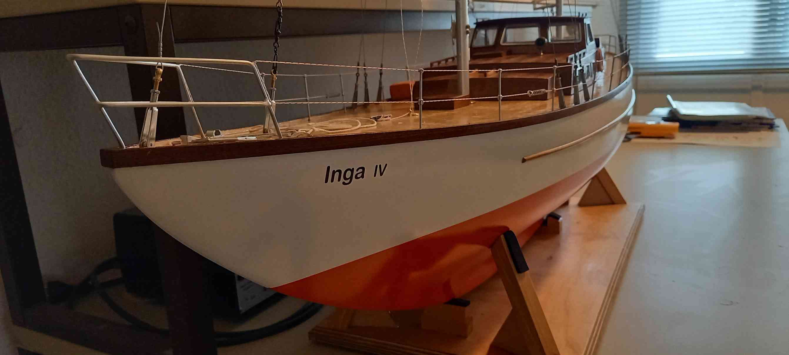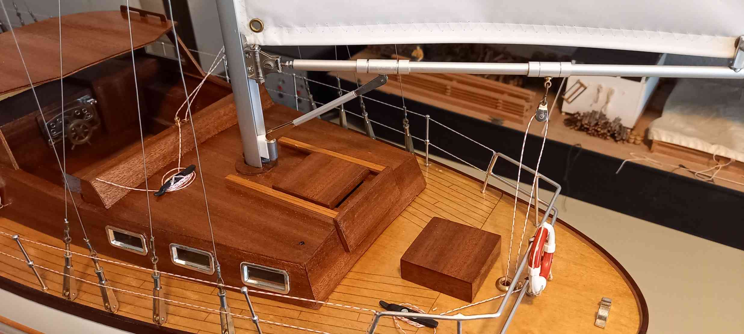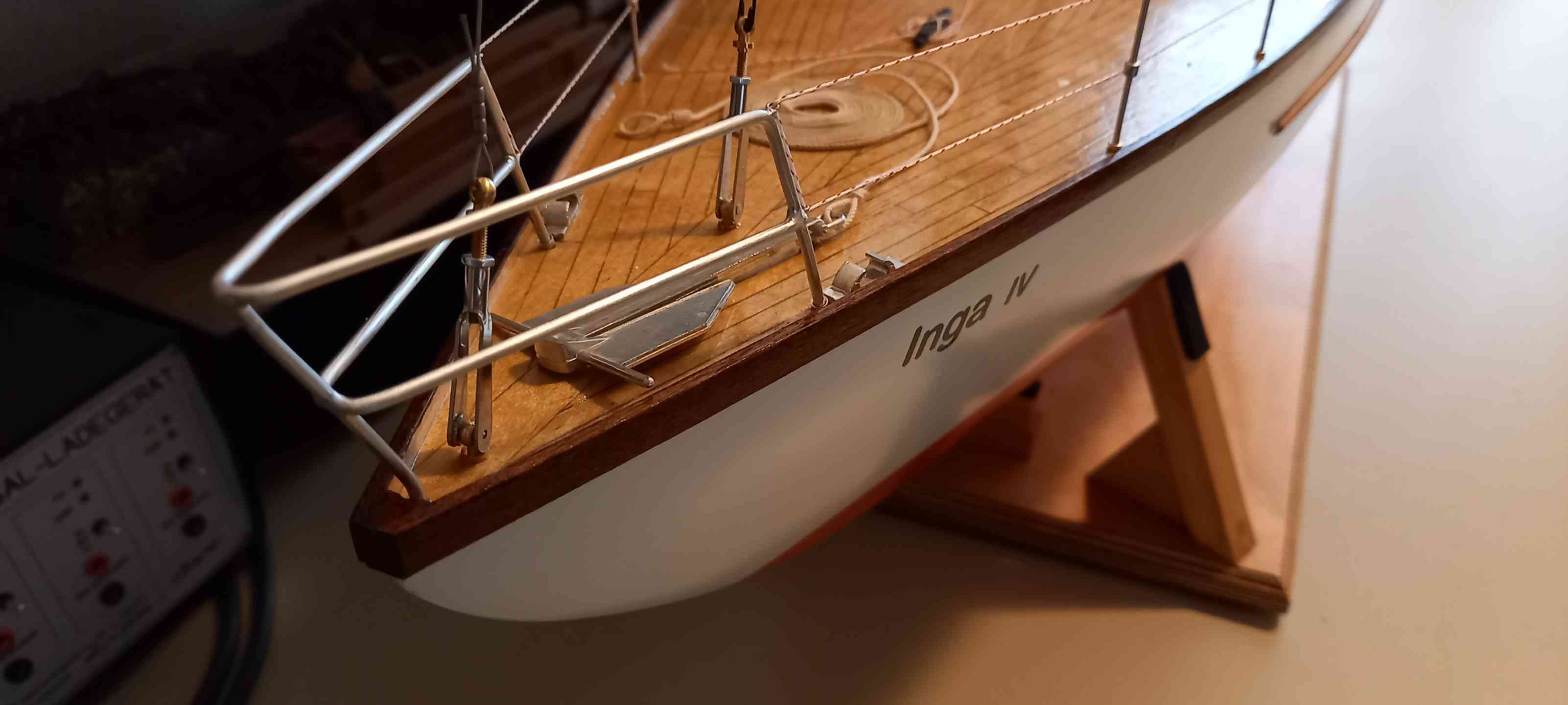 Basis ist ein in die Jahre gekommenes, sauber gebautes Modell. Restaurationsarbeiten: Neulackierung, Deckabschluss verstärkt, neue Bäume und Niederhohler, Bug-, Heckkorb hart gelötet und die Reling aufgefrischt. Um die Zugänglichkeit zur RC-Anlage zu vereinfachen, ist der Aufbau vor dem Besanmast getrennt und ohne lösen der Takelage abnehmbar. Ziel, ein gut segelndes Modell, die Vorbildtreue ist weniger wichtig.