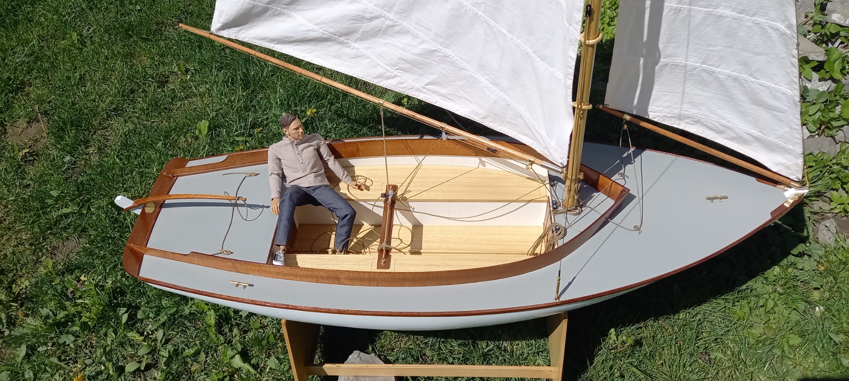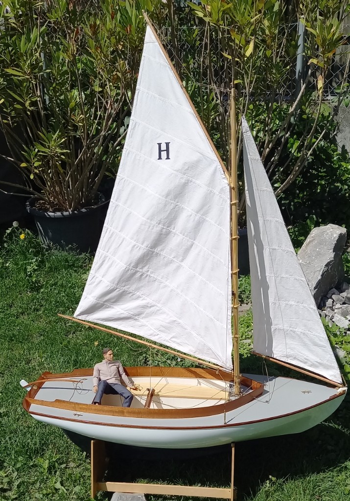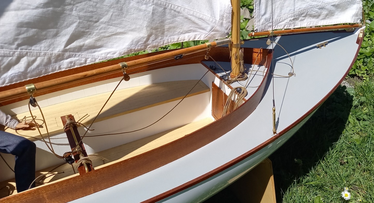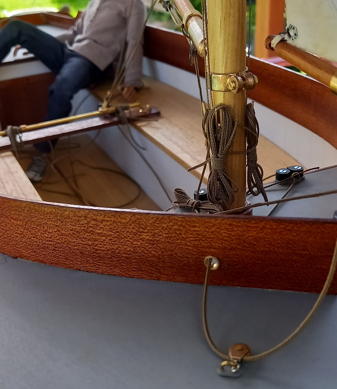 Mit Hilfe von Originalplänen erweitert um Gaffelsegel und vorbildähnliche Beschläge aus Messing.