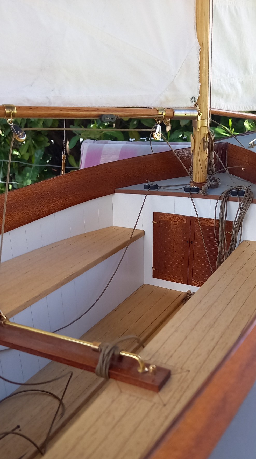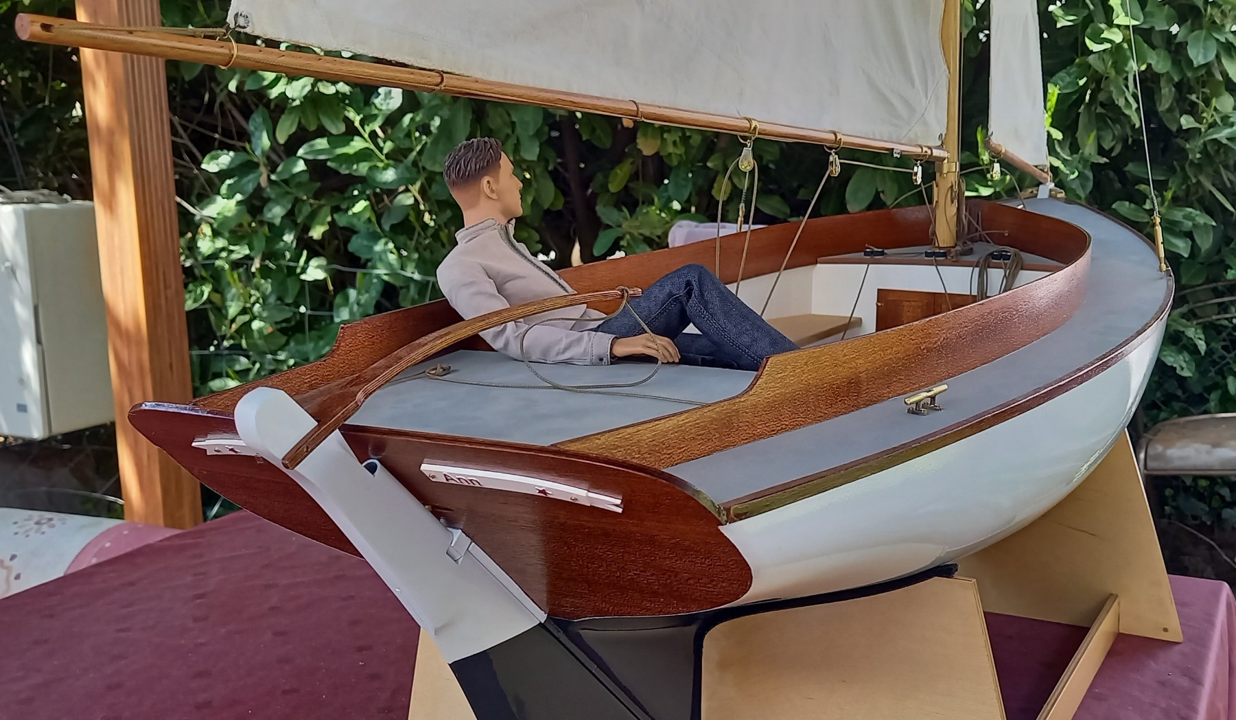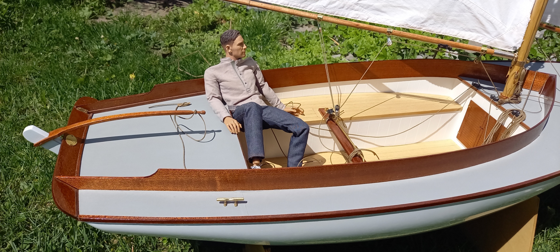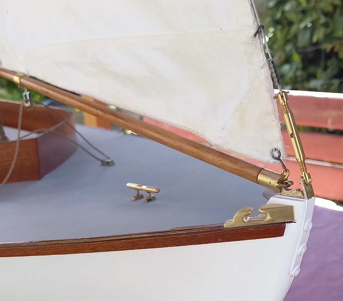 Mit Hilfe von Originalplänen erweitert um Gaffelsegel und vorbildähnliche Beschläge aus Messing.